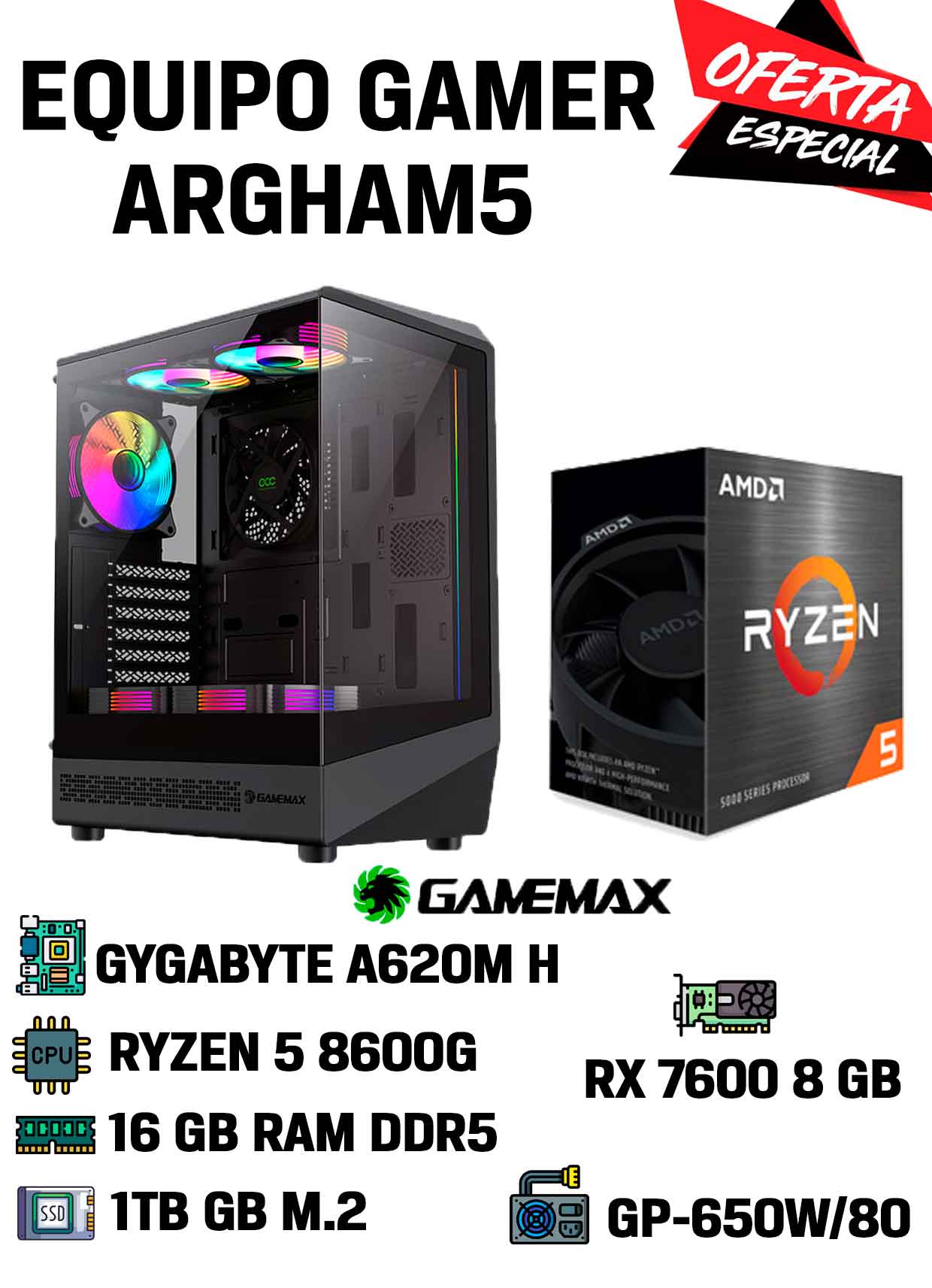 Todo esto está montado en un gabinete Gamemax con una placa madre Gigabyte A620M H, asegurando una base sólida y una estética moderna con excelente flujo de aire y gestión de cables. La fuente de poder GP-650W/80 garantiza la estabilidad y eficiencia energética necesarias para todo tu sistema.